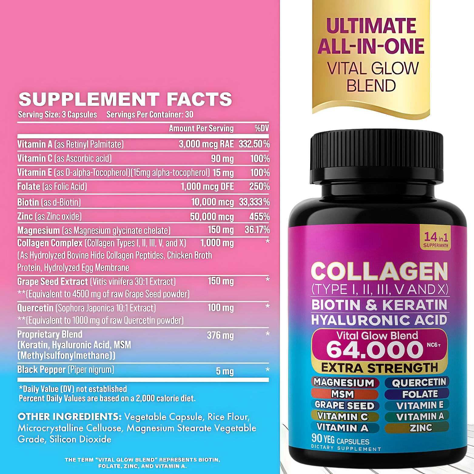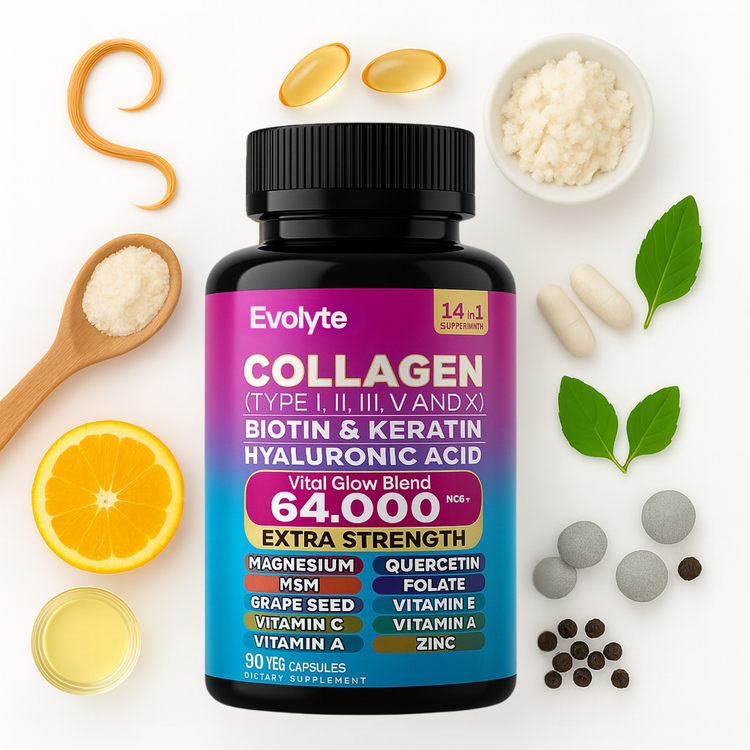 Experience the rejuvenating effects of our Collagen + Vital Glow Blend! This powerful 14-in-1 formula combines collagen types I, II, III, V, and X with biotin, keratin, and hyaluronic acid to support radiant skin, stronger hair and nails, healthy joints, and overall vitality. Join countless satisfied customers and discover your glow from within.
